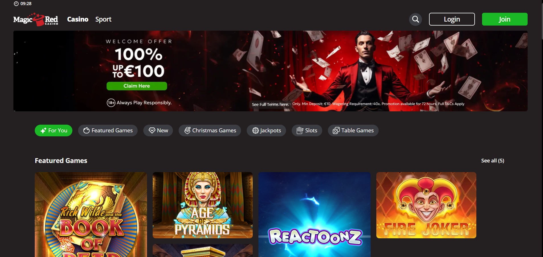 MagicRed Casino ⭐⭐⭐⭐☆ (4/5) 100% up to £100 + 100 Free Spins Large slot library & Slingo titles